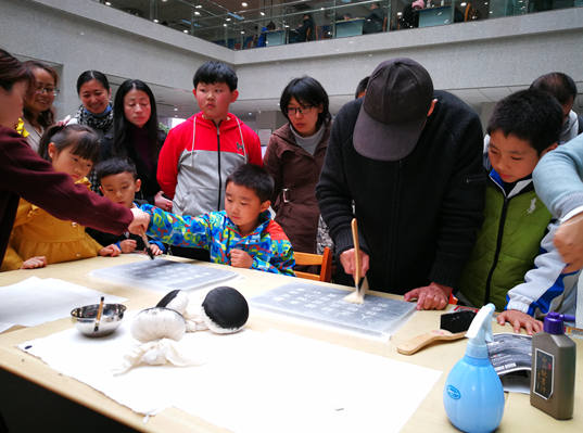 21日上午,青岛市图书馆在二楼大厅为市民们举办了“传拓技艺体验”及“缝制一本线装书”活动。市图书馆的专业古籍人员带大家将宣纸覆在石刻上面,然后用刷子慢慢拓出清晰的文字,亲身体验了传拓技艺的神奇魅力。