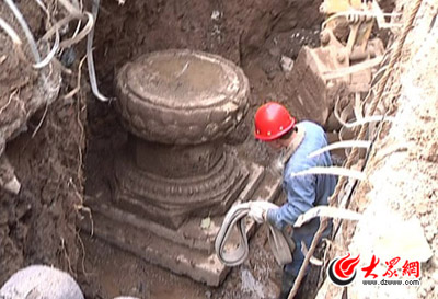 大众网济南12月2日讯(记者 韦辉 盛堃)11月23日,济南市县西巷一电缆施工现场发现佛教经幢底座引起了社会各界的关注。经过几天的现场发掘,12月2日下午,济南市考古研究所正式对这个经幢底座进行起吊挖掘。由于历史原因,这个经幢底座最上面一层已经断裂。另外,由于体积和重量较大,考古人员采取了分段起吊。截止下午五点,底座最上面的一块圆形凹槽被起吊完毕,剩下的经幢底座将于3日继续挖掘。