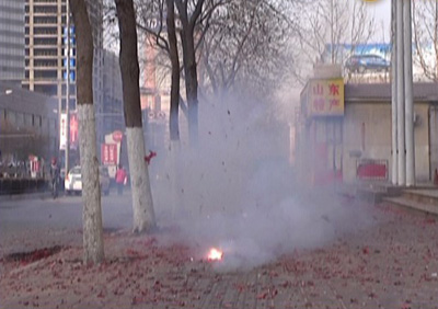解说:记者在街头看到,商家在放开门炮时,不少市民都绕着走,另外,站在高处远远望去,济南上空被一片烟雾笼罩,这些都是烟花爆竹惹的祸。不少市民对于开门炮的燃放也有自己的看法。