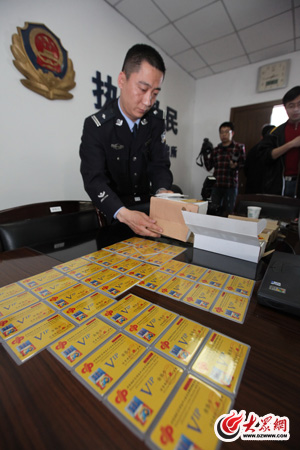 制锦市派出所潘宏副所长整理犯罪嫌疑人用于诈骗的卡片。
