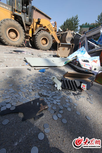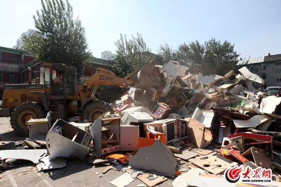 两台挖掘机轰鸣,400台赌博游戏机成为垃圾。(曹亮 摄)