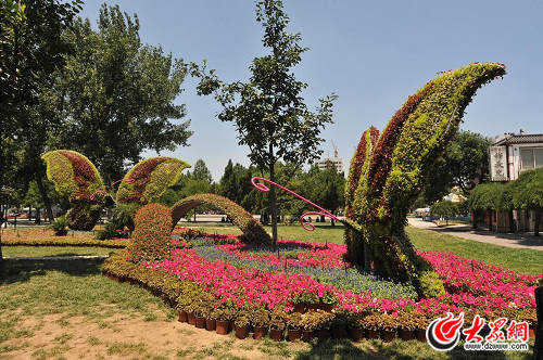 工作人员还对经十西路两侧绿地进行整理、铺种移植等,栽植地被小龙柏、金叶女贞以及月季、蔷薇、冬青球等。经七路口、大金路口等4处节点也通过营造地形、大树组景、配置景石、景松、花卉布置等园林手法,营造了沿线富丽祥和的园林新亮点。各节点的花卉布置独具匠心。腊山立交、兴济河、腊山河三处桥体悬挂的花箱,扎制的花柱、花钵、花球、花树增添了喜庆的气氛。大型花卉立体造型也赚足了大家的眼球,阳光新路路口《魅力槐荫》、槐苑广场《五彩生活》、兴济河桥《幸福槐荫》、腊山河桥《喜庆连连》、担山绿地《风驰电掣》五组造型形成经十路连接有序、热烈喜庆的花海气息。