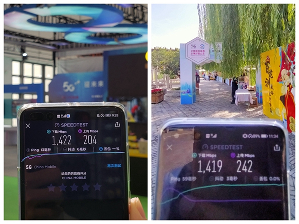 山东移动,5G现场实时速率,下行速率均能达到1.4 Gbit/s以上,上行速率均能达到200Mbit/s以上。