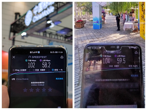 山东移动,4G现场实时速率,下行速率均能达到102 Mbit/s以上,上行速率均能达到58 Mbit/s以上。