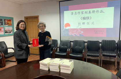 徐月霞馆长代表青岛市图书馆接收了刘真骅老师《痴侠》一书的捐赠,并表达了对刘知侠老师一生致力于回顾革命历史、坚持革命文学创作的敬意。徐馆长表示,青岛市图书馆时刻铭记“传承文明、服务社会”的初心使命,坚持“用文字记录历史,用书籍构建文明”,致力于搭建岛城文化名人艺术作品的收藏、传播、弘扬的重要桥梁与基地。《痴侠》一书的捐赠意义深远,在市图书馆的红色文脉的积淀宝库中将再添重要一笔。也希望刘知侠老师深厚的革命精神、诚挚的爱国情怀能够被更多人传承学习,发扬广大。