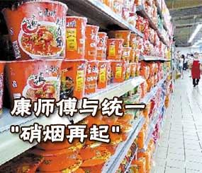 “康师傅与统一一直都打得特别厉害”,中国食品研究院研究员朱丹蓬表示,除了方便面市场外,双方对饮料市场的争夺更为激烈。“如果悬挂了统一产品的宣传画,就不能再挂康师傅的宣传画,统一承诺给我们一定的奖励。”一位小吃店老板表示。处处显现的排他性营销策略也揭示了这两大台湾食品饮料企业水火不相容的状态,“这是一个很有趣的现象,在同一家商店中,可以悬挂有雀巢、可口可乐等饮料产品的宣传画,唯独统一和康师傅泾渭分明”,一个业内人士指出。