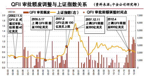 中金公司的汪超表示,全年新增QFII额度有望达到155亿美元(约976.5亿元人民币),按70%的QFII仓位假设,则有望为A股市场带来新增资金超过500亿元,对市场资金供给面有改善效果。但QFII流通市值目前仅占A股总流通市值的1.1%,500亿元的增量资金约为市场全年增量资金的5%~10%左右,对市场资金面难以起到质变的效果。