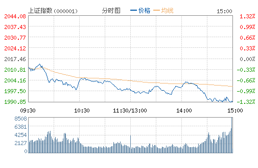 在年底流动性趋紧等负面消息影响下,沪深两市连续下挫,沪指今日早盘低开低走,午后跌幅扩大,本月以来第三度跌破2000点心理大关,午后沪指最低下探至1990.34点,再次刷新11月21日创下的1995.17点新低。截至收盘,沪指跌26.30点,报1991.16点,跌幅为1.30%,成交390.8亿,自2009年2月来首次收盘在2000点下方;深证成指跌79.33点,报7936.74点,跌幅为0.99%,成交389.2亿。