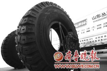 展会现场一条3.6米高1米宽3.65吨重的超级大轮胎吸引了市民的目光。 本报记者 孙国祥 摄