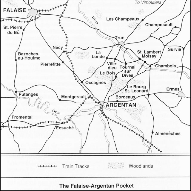 1944年8月的法莱斯包围战地点在靠近法莱斯附近的Trun(特兰)、Argentan(阿尔让唐)、Vimoutiers(维穆捷)、Chambois(尚布瓦)四个城市之间的地区,盟军在此企图包围并试图歼灭德国第七军和第五军。盟军的部署是:以美国第1集团军进行正面防御以阻止德军袭击阿弗朗什(Avranches),并掩护第3集团军的侧后;而美国第3集团军沿勒芒、阿朗松、阿尔让唐机动,迂回德军侧后;加拿大第1集团军从卡昂(Caen)向阿让唐地区进攻,同美国第3集团军会师于法莱斯地域,切断德军退路。