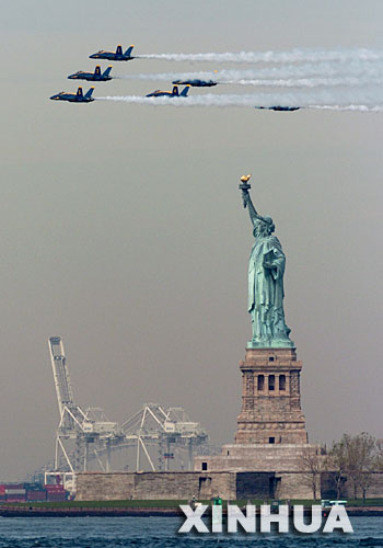 5月25日,美国海军“蓝色天使”飞行编队从纽约自由女神像上空飞过。当天,美国海军“蓝色天使”飞行编队在曼哈顿和纽约湾上空进行精彩表演,庆祝纽约第19届舰队周。 新华社记者赵鹏摄