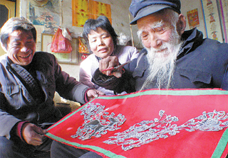1月8日,兖州市嵫山村农民剪纸艺术家王润身(右)为乡亲刻剪麒麟送祥图。他于2001年被兖州市文化部门授予“民间艺术家”荣誉称号。近年来,随着农民生活水平不断提高,山东农村涌现出一大批“拿起锄头干农活,放下锄头搞创作”的农民艺术家,他们的作品具有浓郁的生活气息和乡土特色,受到人们的关注和喜爱。    新华社发