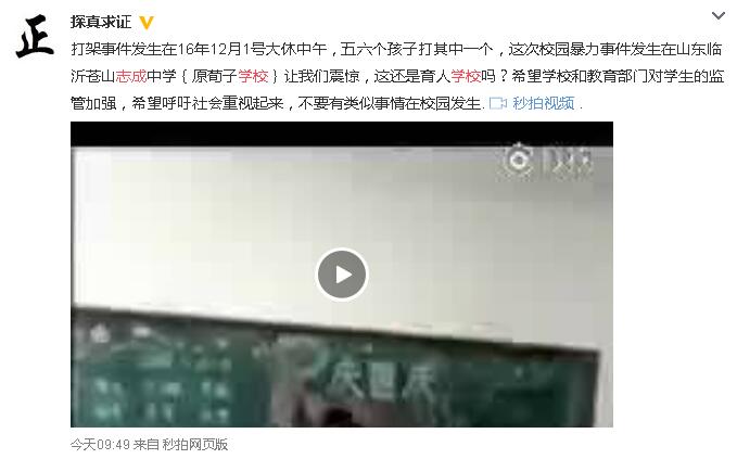 今天上午,网友@探真求证在其新浪微博上发布了一段几名学生在教室里持棍棒围殴一名学生的视频,并配文称:打架事件发生在16年12月1号大休中午,地点是山东临沂兰陵志成学校(原荀子学校)。