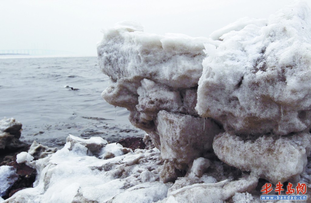 记者走近沿岸的冰层,用手敲击冰块,冰层一点都没有脱落。国家海洋局北海分局的工作人员告诉记者,这叫做沿岸冰,属于固定冰的一种,与海岸冻结在一起的冰层,从海岸向海里延伸,其宽度可以相差很大,在潮汐的影响下,沿岸冰有时可做垂直的升降运动。