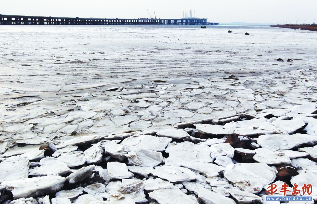 1月5日冷空气驾到,胶州湾浮冰的成长速度明显加快,记者在跨海大桥附近看到,白色的冰层在海面上绵延数百米,同时,沿岸冰如地毯般铺在海岸上。据国家海洋局北海分局预测,6日至8日,渤海、黄海北部及胶州湾冰情将略有发展,会对养殖业等造成一定影响。