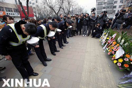 1月5日,泰安市民警在案发现场悼念牺牲战友。新华社记者 朱峥摄
