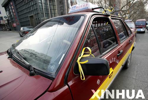 1月5日,泰安市出租车司机悬挂黄丝带悼念牺牲的民警。新华社记者 朱峥摄