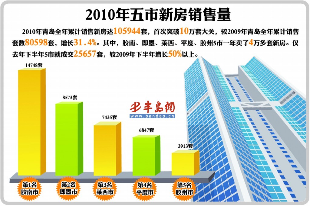 根据青岛市房地产交易中心公布的数据,2010年青岛全年累计销售新房达105944套,首次突破10万套大关,较2009年青岛全年累计销售套数 80598套,增长 31.4%。值得注意的是,五市一年卖了4万多套新房,在青岛楼市中的地位开始提升。从各区市成交情况看,胶南市以14748套排在2010年全市各区成交量的第一名,胶南市在2010年度有两次月度成交超过两千套,1月份成交2044套,5月份成交2431套。