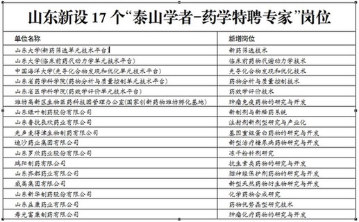 山东省委、省政府日前确定在全省新设17个“泰山学者—药学特聘专家”岗位,潍坊市的“肿瘤免疫药物的研究与开发”(潍坊高新区生物医药科技产业园管理办公室)和“肿瘤化疗药物的研究与开发”(寿光富康制药有限公司)2个岗位名列其中。