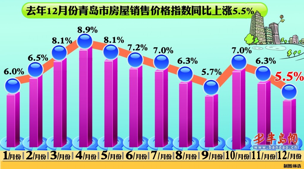 1月17日上午,国家统计局发布了去年12月份全国70个大中城市房屋销售价格指数,70个大中城市房屋销售价格同比上涨6.4% ,环比上涨0.3%。青岛市房屋销售价格指数同样保持了上涨势头,数据显示,青岛市房屋销售价格指数同比上涨5.5% ,环比上涨0.5% 。