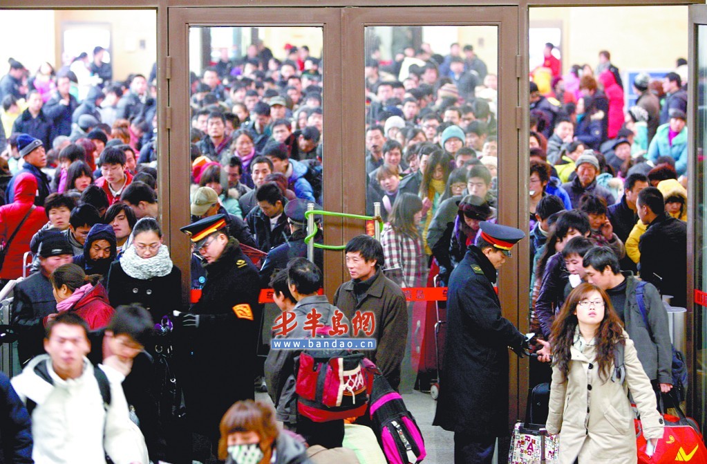 1月19日全国铁路春运拉开大幕。下午4点,青岛火车站候车厅检票口的大门打开,准备乘坐1564次列车从青岛赶往郑州的旅客们鱼贯而入。在为期40天的春运期间,青岛从1月18日到2月2日将现客流最高峰 ,预估2011年春运青岛旅客运输量将达967.46万人次。 记者 李隽辉 摄