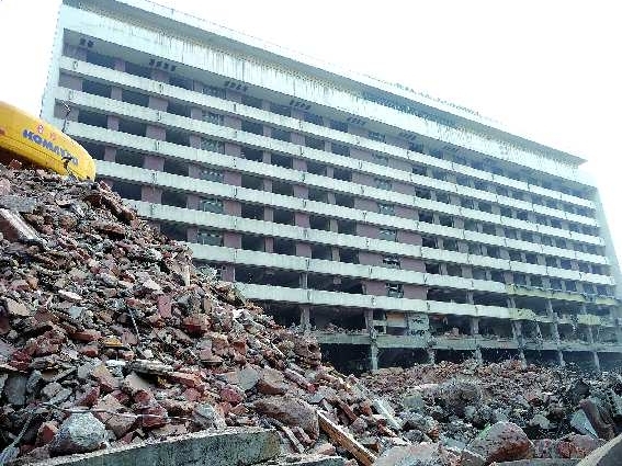 本报连续独家报道齐鲁宾馆爆破的消息后,齐鲁宾馆何时爆破就一直牵动着济南市民尤其是宾馆周围居民的心。22日下午,记者在位于经十路与千佛山路交叉口东南角的齐鲁宾馆看到,与前几日相比,齐鲁宾馆老楼的拆除工作有了明显进展。自12日下午开始,齐鲁宾馆的拆除工作已经持续进行了11天,目前,11层35米高的齐鲁宾馆的一、二层已经完全被掏空,几辆大型挖掘机正在清理拆下的建筑垃圾材料。齐鲁宾馆老楼的东侧,砖头、水泥板、钢筋等材料堆积得像座小山。