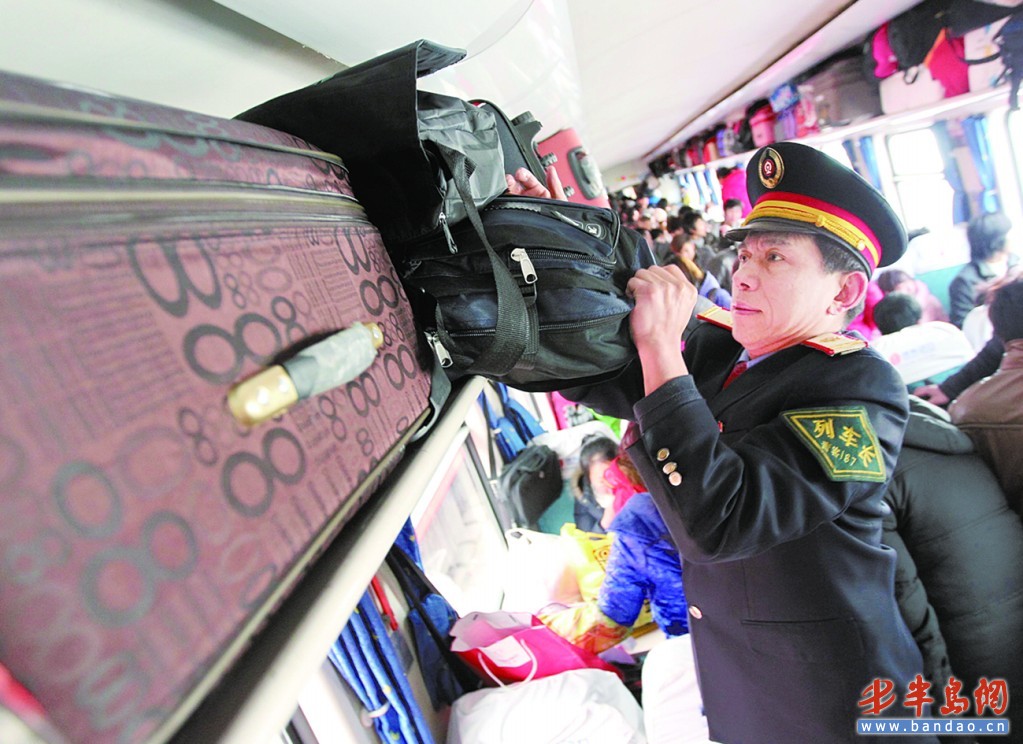 列车长韩成章检查行李的摆放,以确保旅客安全。