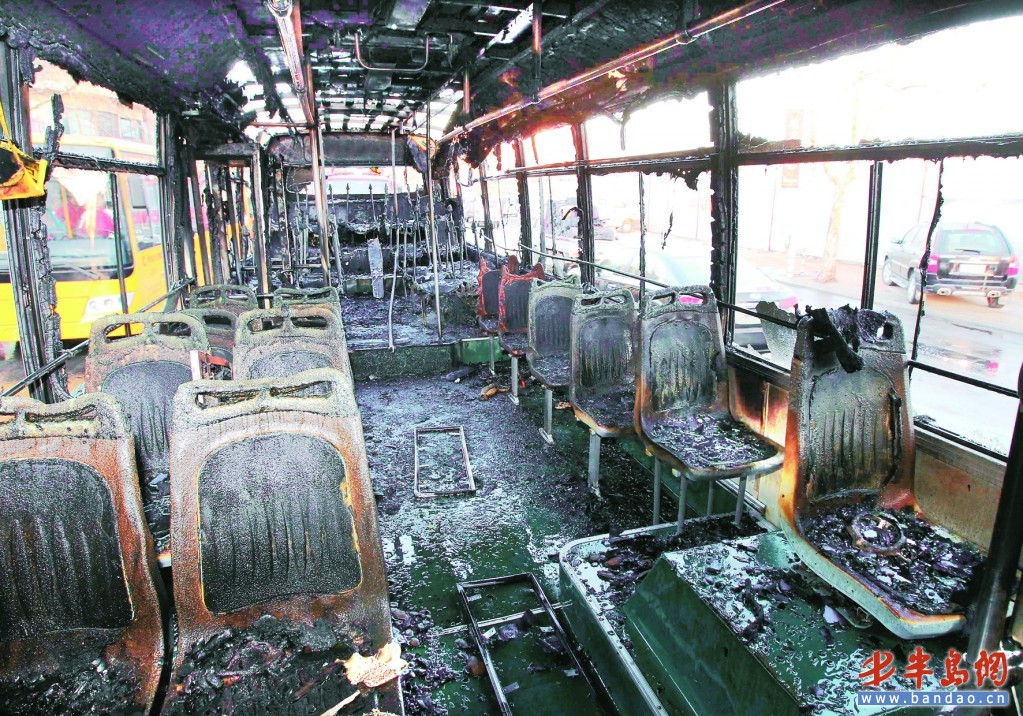 公交车被烧得面目全非。