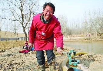 12日,梁山县的陈广荷正从渠里引黄河水浇田。