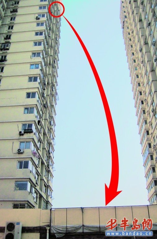 男子从27楼(红圈处)坠落到了两栋楼之间的平台上。
