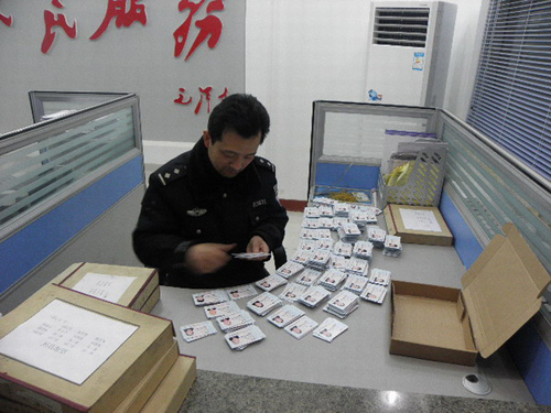 春节前后,民警们利用休息时间加班加点,将2000多张未领取的二代身份证按照各个行政村分别进行整理。利用春节期间下村走访和下村办案的时机,将身份证送到群众手中。通过开展此次活动,民警共送证300余张,受到了辖区群众的广泛好评。图为民警刘永刚在整理为外出务工人员所办理的二代身份证。