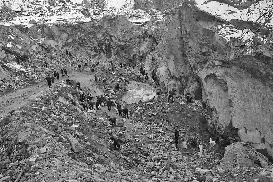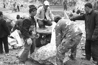 在村民采石的集中地点,记者看到,几十米深的山谷里人头攒动,他们正在叮叮当当地敲打着山石。在通往山谷的一条陡坡上,有的村民扛着石头往上走,有的则是三五结伴用独轮车推着石头往外运。“从昨天夜里11点左右开始,附近村庄的村民都过来挖玉石,我们是今天早晨才过来的。”一位姓孙的村民告诉记者。