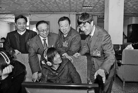 15日上午,在济南青年公园街道办事处管区的一家网吧,政协委员李钢、李长宁、王仁华和李玉华(后排从右到左)进行调研。 本报记者 王媛 摄