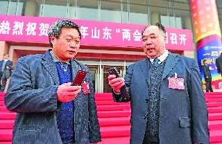 17日下午,历时六天的省十一届人大四次会议闭幕。图为会后省人大代表、济南趵突泉酿酒有限责任公司董事长邢介平(右)与省人大代表、济南市历城区金刚纂村党支部书记马广业交换联系方式。