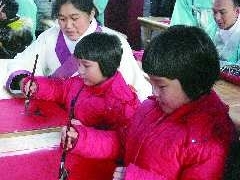 开笔礼仪式上,孩子们学写“人”字。