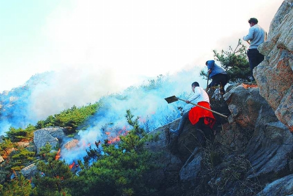 4日上午11时,位于日照市东港区的河山山系发生大火,逾千军民紧急上山灭火。本报见习记者 张照朋 摄