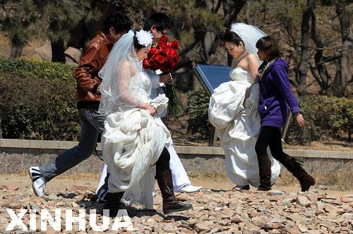 新华网山东频道4月6日电 随着气温回暖,山东青岛海滨婚纱照拍摄生意又开始忙碌起来,前海一线各景区内随处都能见到正在拍摄或匆匆赶往下一拍摄点的新人。据了解,以亲近大海为主题的婚纱照每年都会吸引来众多的顾客,已在当地形成集艺术照拍摄、蜜月旅游、集体婚礼等一条龙服务完整的产业链。