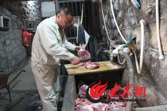 第一道工序是用清水冲洗牛肉,把肉表面的鲜血冲洗掉,然后再把大块的牛肉切成条状。“狮子老虎见了肉就红了眼,嚼不了几下就吞进肚子,要是切成大块容易噎着,也不易消化。”