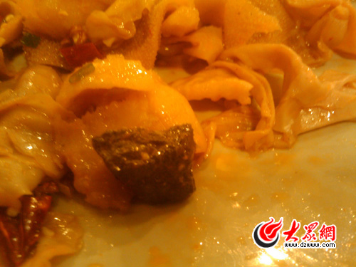 5月30日18时,记者在省城一家酒店吃饭时,竟发现菜中有一水泥块,让人大倒胃口。第二天,酒店王主任打来电话称,水泥块系不小心从原料中混入,已对后厨相关责任人作出严厉处罚。