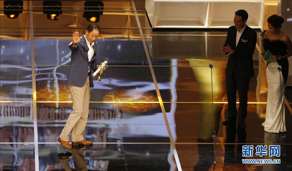 6月13日,在上海东方艺术中心举行的第20届上海电视节闭幕式暨白玉兰奖颁奖典礼上,演员王志文(左)在台上领取最佳男演员奖。王志文凭借在电视剧《大丈夫》中的表演获奖。 当日,第20届上海电视节闭幕式暨白玉兰奖颁奖典礼在上海举行。新华社记者 方喆 摄