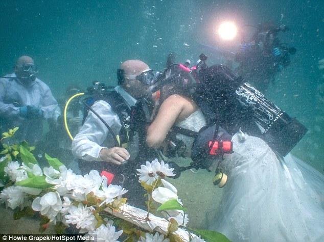 据英国《每日邮报》8月11日报道,美国佛罗里达州52岁的Bill Frenier和32岁的Lizbeth Espejo Frenier是一对疯狂的潜水爱好者,于是他们决定在大西洋中举办婚礼。这对具有冒险精神的美国夫妇,新娘穿着婚纱,新郎身着礼服,在9米水下结为夫妇。一身潜水装备的治安官及他们的亲友见证了这个浪漫的过程。