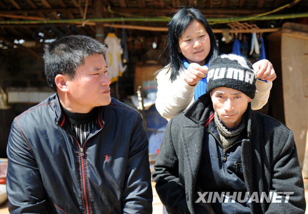 3月11日,“犀利哥”程国荣三姐弟在一起,姐姐程国珍在给他整理帽子。新华社记者周科摄