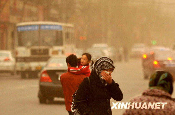 3月16日,市民走在沙尘弥漫的兰州街头。