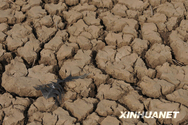贵州草海保护区内,一些湿地已经干涸,因干旱草海保护区黑颈鹤提前迁徙(2010年3月14日摄)。新华社发