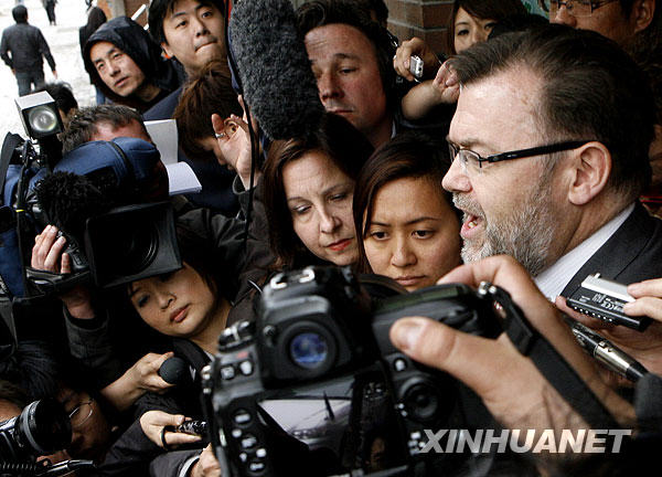 3月29日,澳大利亚驻沪总领事汤姆·康纳在法院外接受中外媒体采访。 当日,上海市第一中级人民法院对被告人胡士泰等非国家工作人员受贿、侵犯商业秘密案作出一审判决,分别以非国家工作人员受贿罪、侵犯商业秘密罪,数罪并罚判处被告人胡士泰有期徒刑十年,并处没收财产和罚金人民币100万元;王勇有期徒刑十四年,并处没收财产和罚金人民币520万元;葛民强有期徒刑八年,并处没收财产和罚金人民币80万元;刘才魁有期徒刑七年,并处没收财产和罚金人民币70万元;违法所得均予以追缴。 新华社记者 陈飞 摄