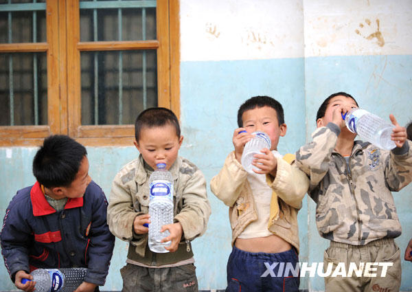 3月30日,天峨县坡结乡龙凤村完全小学的同学们在品尝刚刚领取的纯净水。
