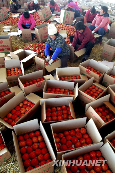 4月7日,山东省郯城县一家蔬菜供销公司的职工分拣包装专供上海世博会的西红柿。