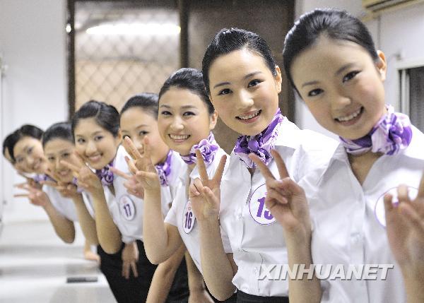 当日,由南方航空公司举办的第五届“空姐新人秀”电视晋级赛在武汉举行。从1万多名报名者中层层选拔出来的61名选手,将通过这次比赛的表现,最终获得空姐职位。其中的优秀选手还将参加“亚运空姐总决赛”,选出的精英将在亚运精品航班上为各个国家和地区的运动员、官员和来宾服务。新华社记者 程敏 摄