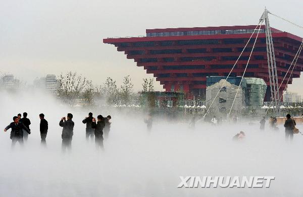 当日,工作人员对上海世博会庆典广场上的喷泉设备“试水”。白色的水雾喷洒而出,让置身其中的游客如临仙境。 新华社发(蔡耀放 摄)