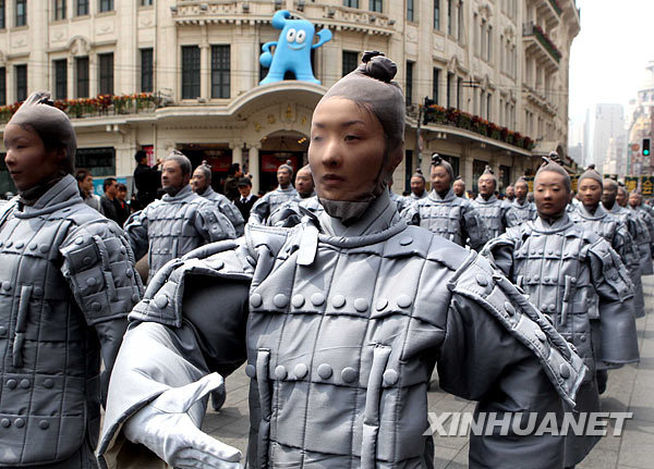 4月10日,“兵马俑”行走在上海南京路步行街。当日,由西安市政府主办的兵马俑牵手上海世博会大型旅游宣传咨询活动在沪举行。此次活动的亮点之一——“兵马俑”百人方阵巡游在南京路步行街上演,100名身着兵马俑服装的演员在行进的过程中进行壮观的队列表演,吸引了众多游客和上海市民的目光。新华社记者张明摄